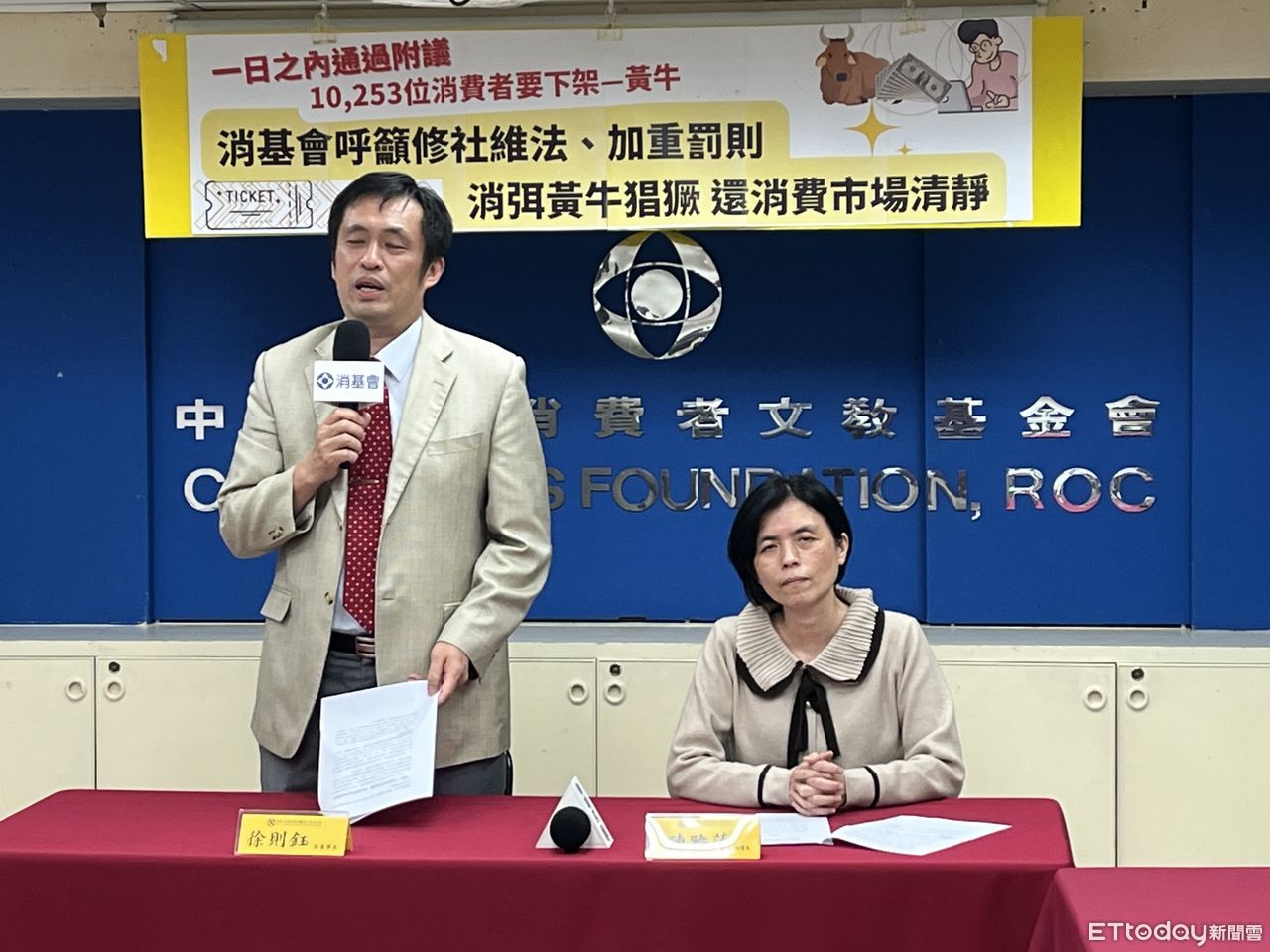 ▲消基會副董事長徐則鈺與秘書長陳雅萍(右),呼籲透過修改社維法並重罰,消弭黃牛猖獗狀況。(圖/記者許敏溶攝)