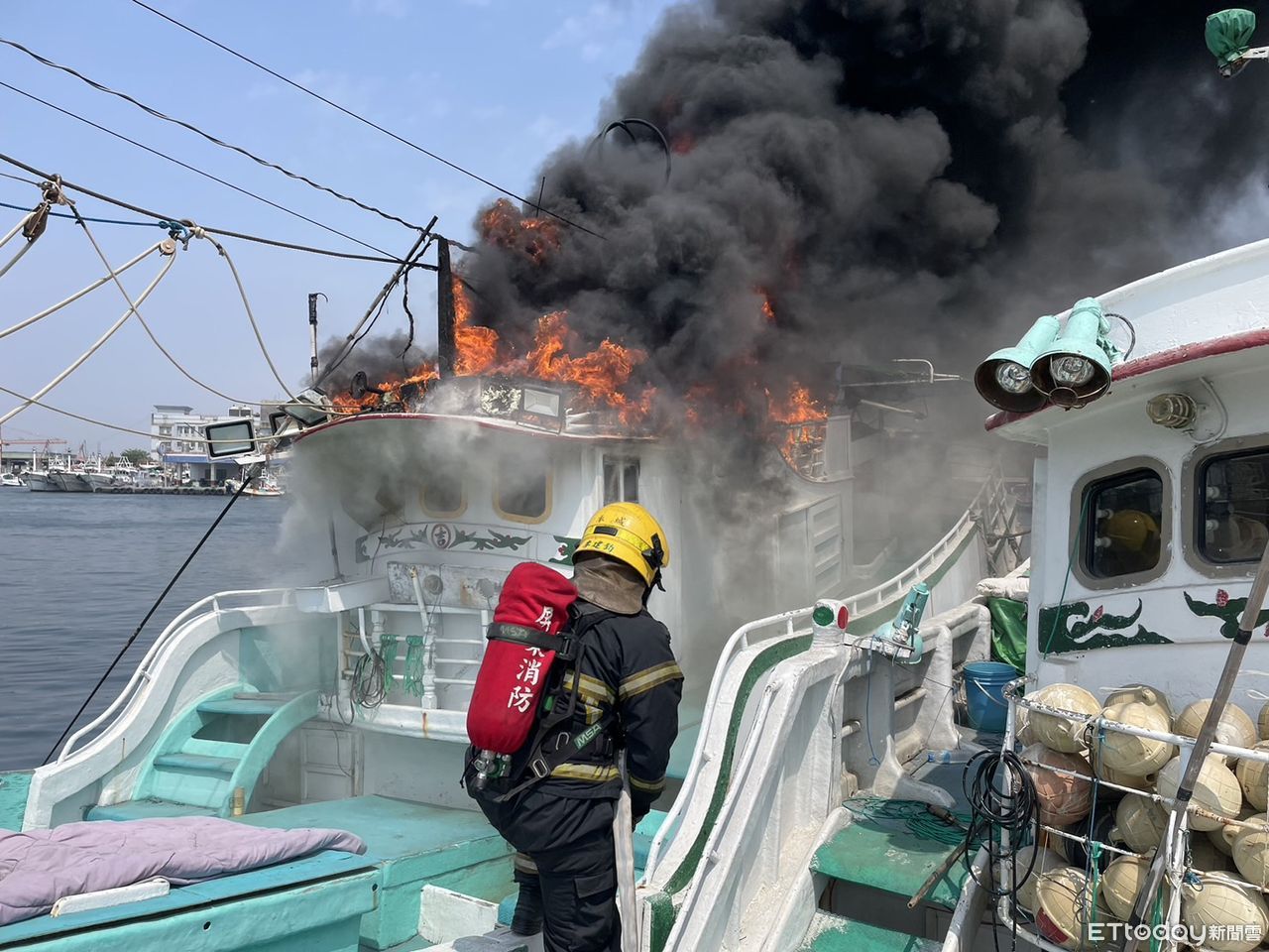 ▲東港漁港火燒船,消防人員趕緊滅火 。(圖/記者陳崑福翻攝,下同)