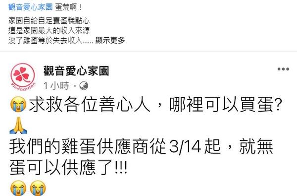 江承洲臉書表示,「觀音愛心家園烘焙坊」蛋商供應商,14日起停止供應雞蛋,由於家園的烘焙坊長年來,自給自足賣蛋糕點心是他們的最大的收入來源,沒了雞蛋等於失去收入,請問誰有認識的蛋商,能幫幫家園的夥伴們?