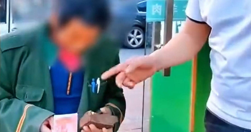 ▲拾荒男拿著2張面額100元的冥紙想買羊肝。(圖/翻攝自微博)