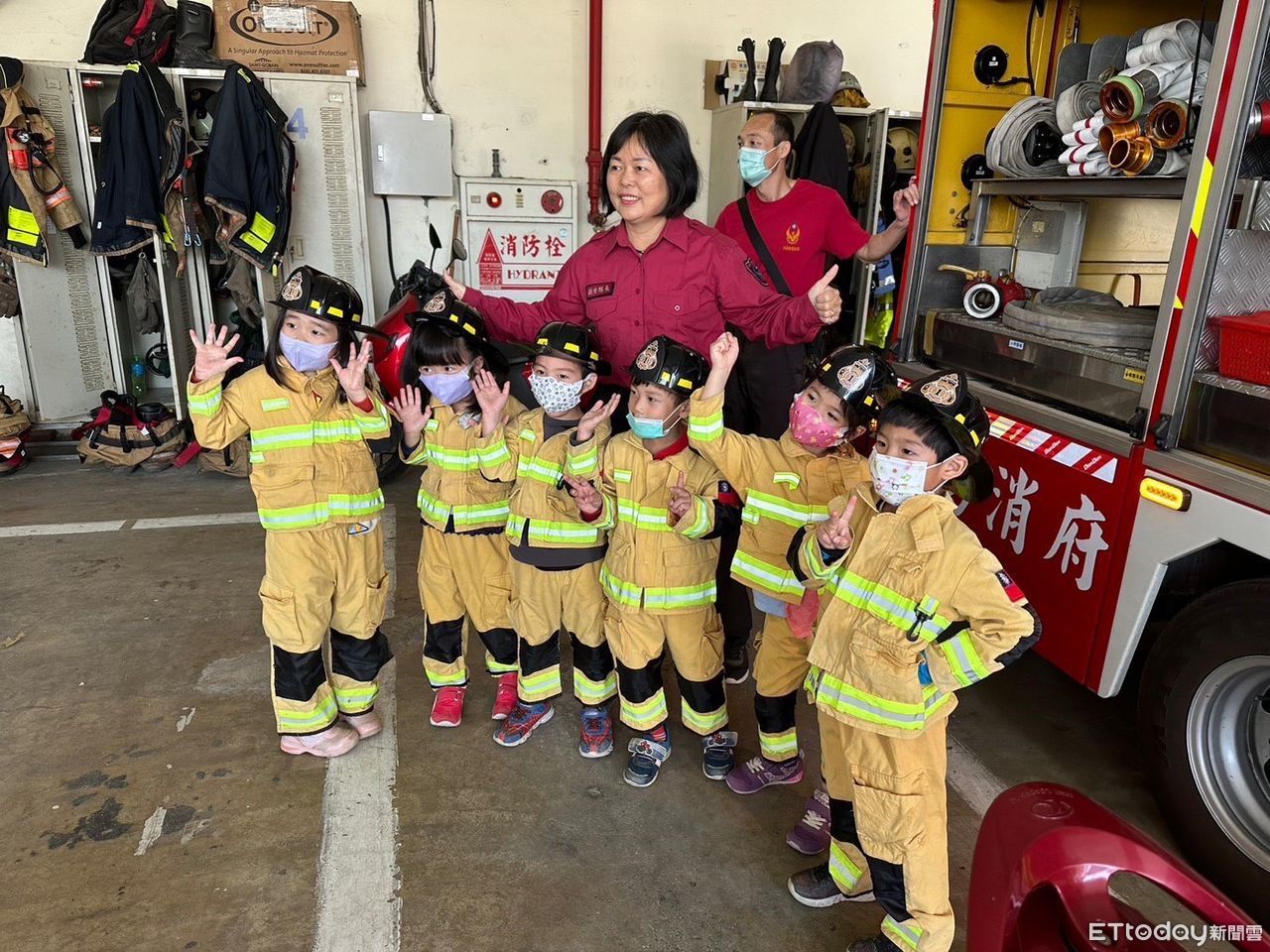▲台南市水交社非營利幼兒園師生約120人,上午至消防局第七大隊南門分隊參訪,除體驗各項消防裝備設施外,並更進一步了解防火防災的重要性。(圖/記者林悅翻攝,下同)