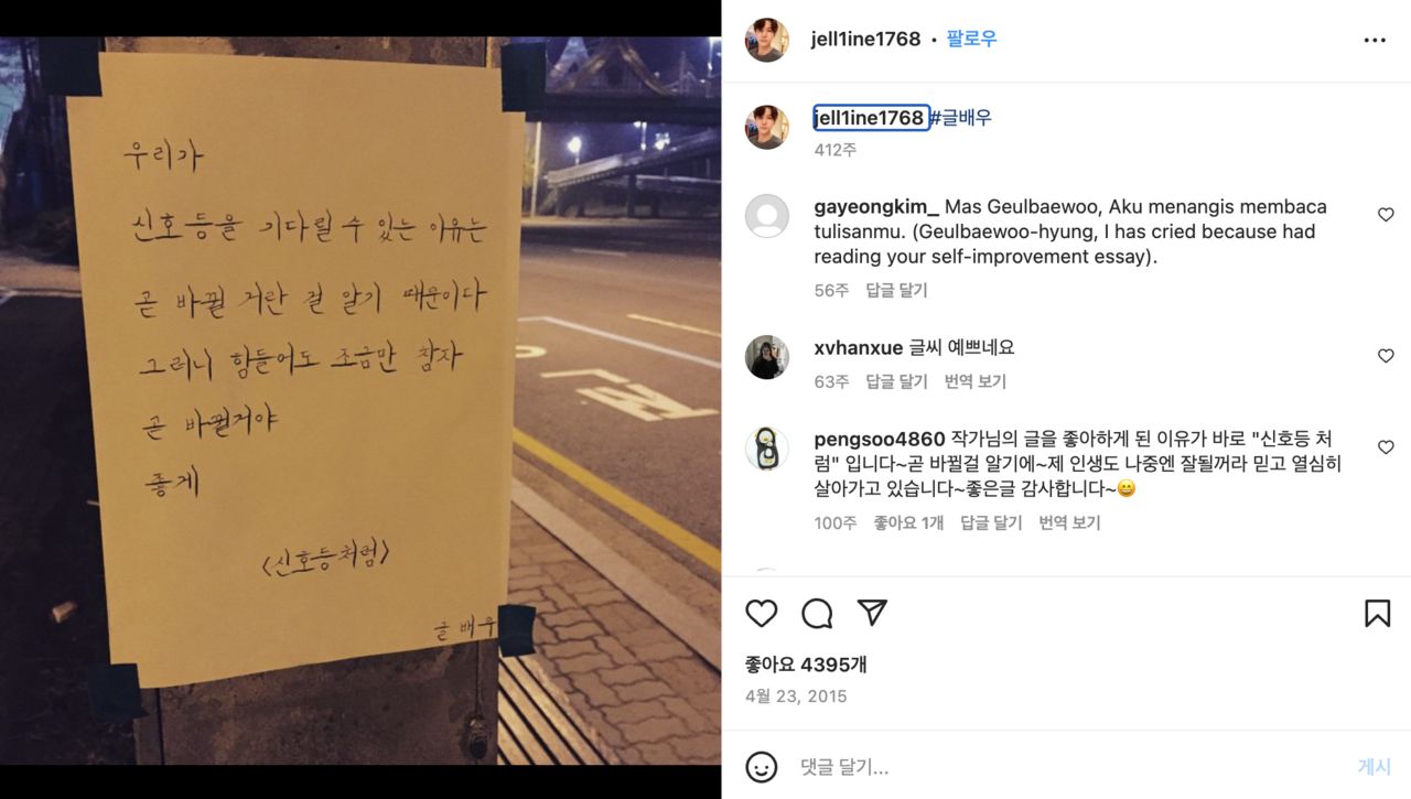 ▲韓國作家「寫字的人」金東奕,經常寫下傳單文字貼在電線桿上,某日一夕爆紅。(圖/翻攝自Instagram @jell1ine1768)