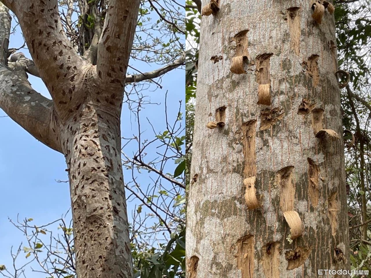 高雄市南柴山相思亭對面一棵小葉欖仁樹,近日民眾發現樹幹上滿佈密集規律的孔洞,山友拍下照片引發熱議,有柴山志工認為只是松鼠缺水亂咬導致,但柴山動植物專家楊吉壽卻認為,這些孔洞太規律又呈現三角錐形,而且樹皮還留在樹上,可能是有人「試槍」。