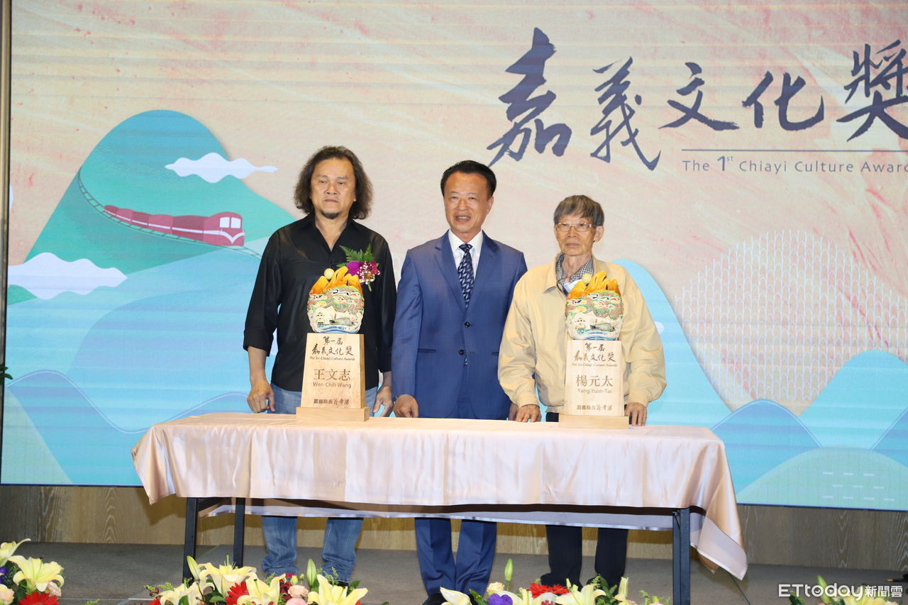 嘉義縣文化觀光局2022年起籌辦嘉義文化獎,設獎項鼓勵深耕在地、長期耕耘藝術領域的工作者,20日上午舉行第一屆頒獎典禮,經委員會評選2位代表性藝術工作者:陶藝家楊元太及地景藝術家王文志受獎,縣長翁章梁親自頒發交趾陶大師謝東哲設計製作的獎盃及獎勵金30萬元整。