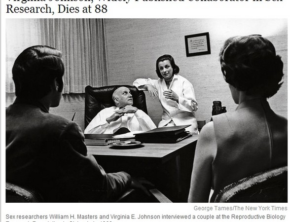 「性學大師」維吉尼亞.強生(Virginia Johnson)是以科學研究人類性行為的先驅者,據美國媒體報導,她已辭世,享壽88歲。她和前夫威廉.麥斯特斯(William Masters)曾組成性學研究小組,並首創以裝有內視鏡的假陽具,進入女性陰道,以攝影機觀察女性性高潮時的生理狀況。