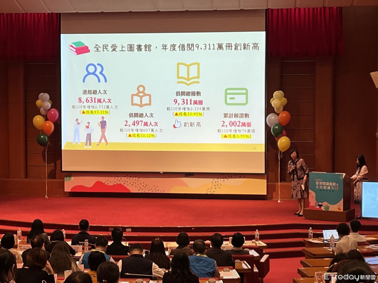 此外,曾淑賢表示,去年全年借閱總冊數超過9311萬冊,較前一年大增2334萬冊,成長幅度超過3成3,也創下歷年新高,全國每人平均借閱4.0冊;另在累計辦證方面,去年全國累計辦證數達到2002萬張,比前一年增加76萬張、成長3.95%,顯示各縣市圖書館服務,持續吸引新面孔加入圖書館讀者行列。