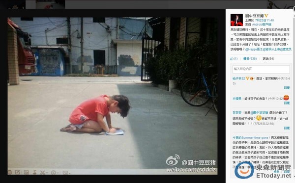 ▲大陸一名狠心父親,因女兒作業錯太多,竟罰她在50度高溫的地面上跪著長達1小時。(圖/翻攝自微博)