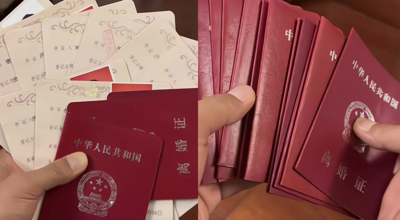陸媒報導,上海有名27歲男子曬出多本離婚證,並表示每本都是從民政局(婚姻登記處)領出來,「想不明白是自己的問題,還是她們(前妻)的問題」。從圖片可見,共有9本結婚證和8本離婚證,全疊共有17本。男子未夠30歲已「9結8離」,因為他於3月27日再次申領結婚證,正式宣告展開第九段婚姻。