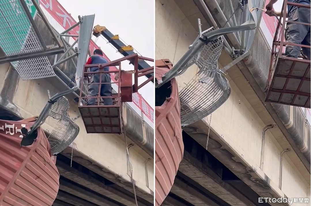 而從現場影片中可看到,聯結車經過時貨櫃撞擊橋上的道路標示牌以及支撐架,其中一面標示牌落在道路上,而支撐架經撞擊直接插入貨櫃,導致支撐架跟貨櫃連成一體難以分離。為了讓貨櫃能吊離,現場人員用切割器具,對支撐架進行切割將兩者分離。