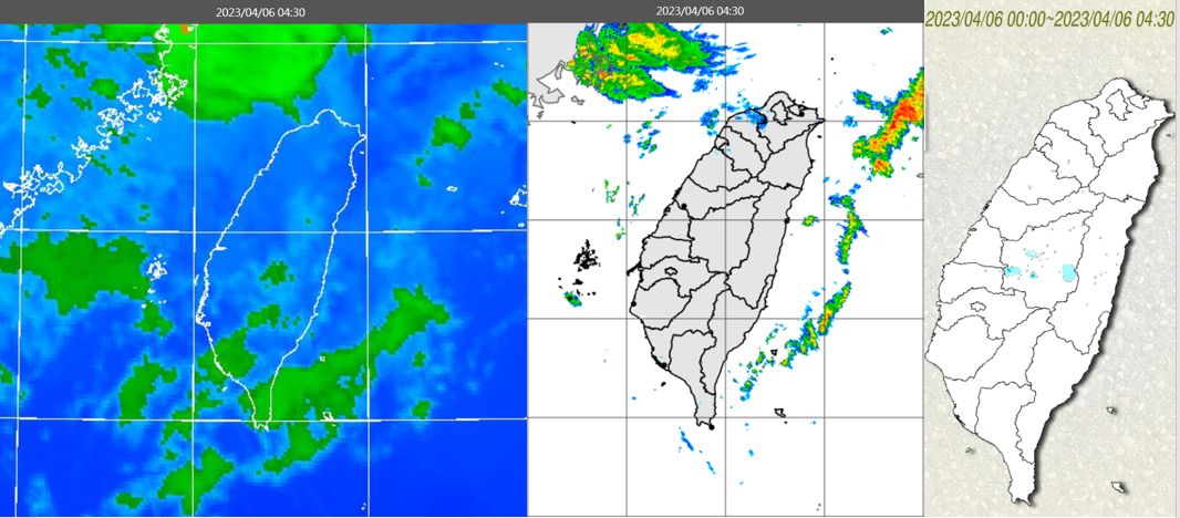 ▲左圖:6日4:30紅外線色調強化雲圖顯示,台灣上空有華南移出的鬆散雲層。中圖:4:30雷達回波合成圖顯示,台灣東側及馬祖附近有降水回波。右圖:4:30累積雨量圖顯示,中部及花蓮有零星飄雨。(圖/三立準氣象.老大洩天機)