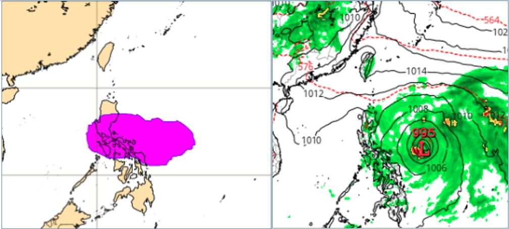 ▼最新(6日20時)歐洲模式(ECMWF) 13日20時系集模擬機率圖(左圖)顯示,菲律賓東方海面有颱風生成的機率;同時美國(GFS)模式模擬圖(右圖)亦顯示,菲律賓東方海面的環流已有颱風的強度。(圖/三立準氣象.老大洩天機)