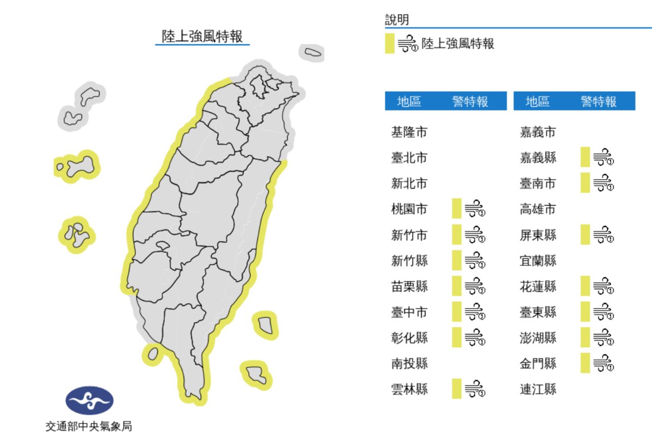 氣象局今上午10點發布陸上強風特報,氣象局表示,東北風明顯偏強,桃園至台南、東部、東南部(含綠島、蘭嶼)、恆春半島沿海空曠地區及澎湖、金門易有9至10級強陣風,其他地區亦有較強陣風,鄰近海域並有較大風浪,請特別注意。