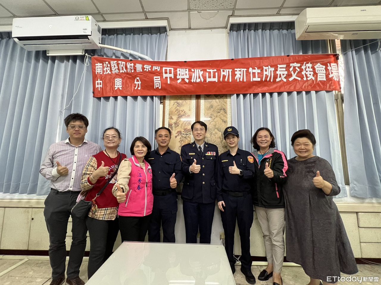 ▲中興分局中興所卸、新任所長交接,南投縣唯一女所長賴渝儒(右3)上任。(圖/記者高堂堯翻攝,下同)