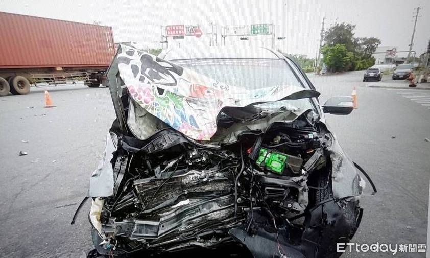 ▲停放路邊的自小客車被撞得車頭全爛。(圖/記者游瓊華翻攝)