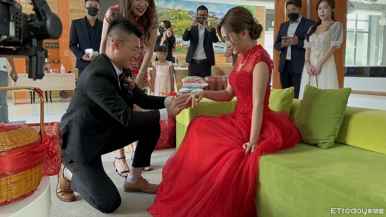 ▲新郎牽起新娘的手,向岳父、岳母拜別。(圖/記者吳奕靖翻攝)
