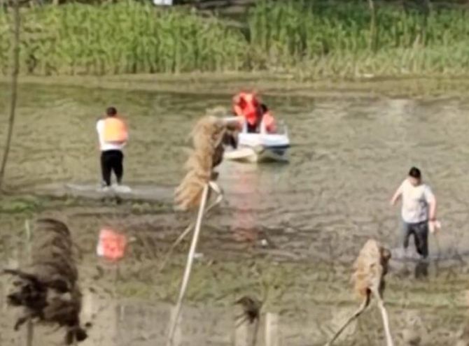 據《極目新聞》報導,一段現場搜救影片顯示,有救援人員正在水中徒步搜索,還有人乘坐小船在水面上搜索。影片發布者配文表示,「天樂湖這個設施下次別玩了,不知道最後人怎麼樣了。」