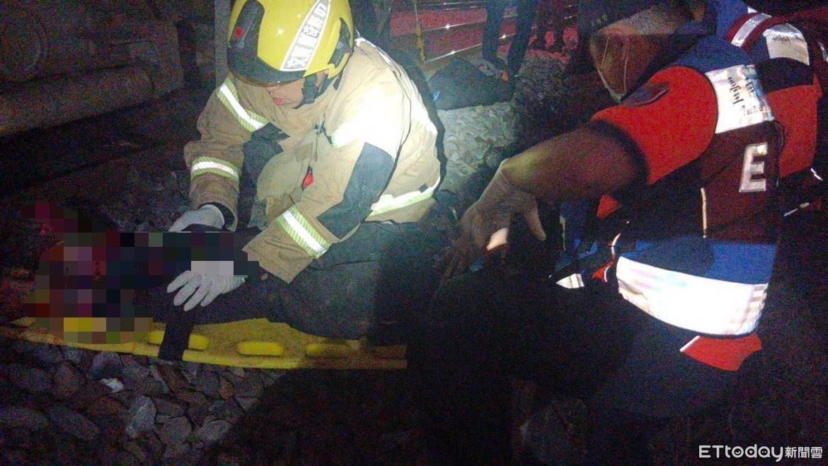▲台南市仁德區台鐵保安站至台南站間,發生男子闖入鐵軌遭自強號列車撞擊事故,台南市消防局派員將傷者搶救脫困,送成大醫院急救中。(圖/民眾提供,下同)