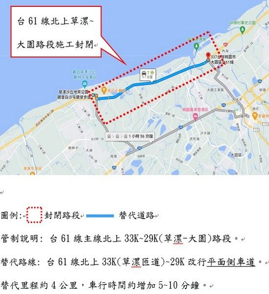 4月13日晚上10時至14日上午6時,將封閉台61線主線北上33K(草)-29K(大園)路段及草漯(33K)入口匝道,屆時請由台61線主線北上33K(草漯匝道)改行平面側車道,並於台61線主線北上29K(大園匝道)返回台61線主線北上續行。車行時間約增加10分鐘。一工處籲請用路人,行經該路段車輛遵循標誌指示減速慢行並提前改道,以維行車安全。