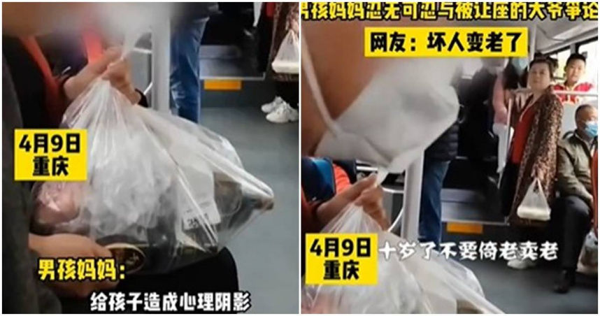 據《星島頭條》報導,重慶一位韓姓女子9日帶兒子坐公車,因為人潮不多,她們分別坐了2個位置,此時一名7、80歲的老人上車,她抱起兒子讓座,但老人開罵,尊老愛幼,尊老在前面,孩子讓座反應那麼慢是癡呆了。