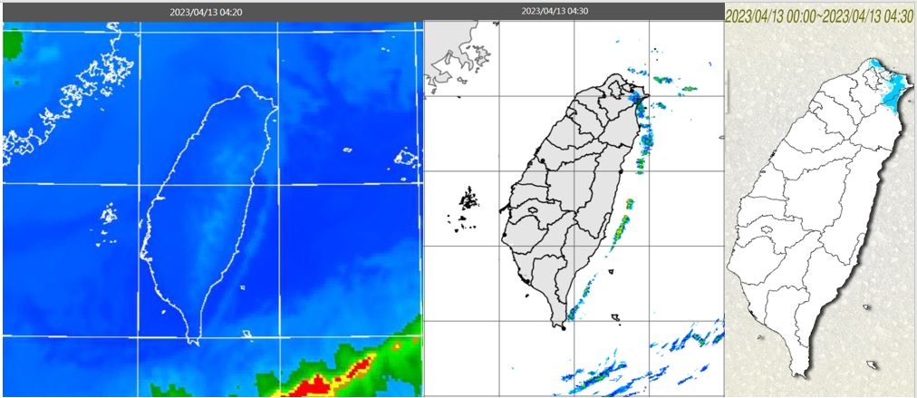 ▲左圖:13日晨4:20紅外線色調強化雲圖顯示,台灣東北角的鬆散低雲、正逐漸消散。中圖:4:30雷達回波合成圖顯示,東北角有弱降水回波。右圖:4:30累積雨量顯示,北海岸、東北角有局部降雨。(圖/三立準氣象.老大洩天機)