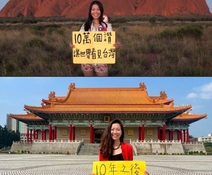 來自台灣的Baobao陳玟臻2013年在澳洲的烏魯魯前,舉著「十萬個讚,讓世界看見台灣」的牌子,獲得55萬名網友支持按讚,她11日在臉書PO文分享她這幾年的心得,「10年過後,世界看見台灣了」。