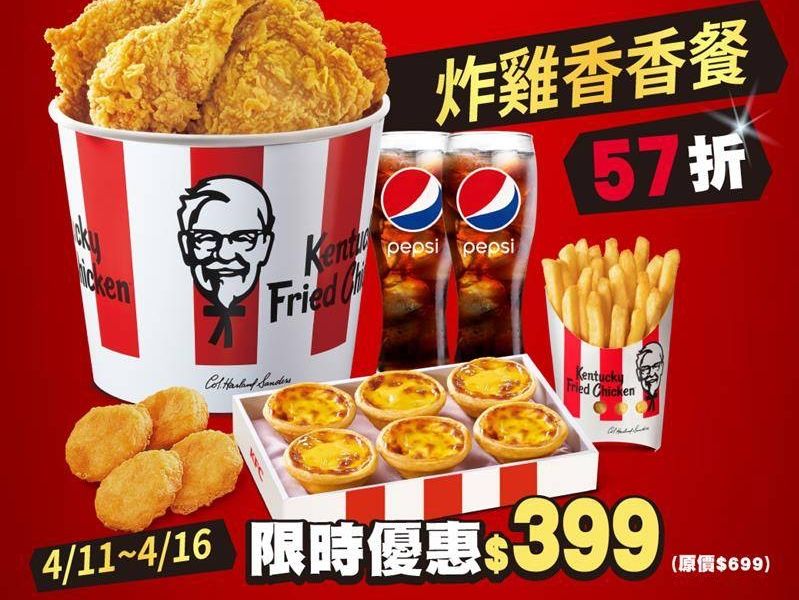 肯德基因此趁勢推出「炸雞香香餐」限時優惠,即日起至4/16輸入或出示優惠代碼「46733」,就能一次享有咔啦脆雞x4塊、上校雞塊x4塊、1份香酥脆薯(大) 、原味蛋撻禮盒x1盒(6顆)+可樂(中)x2,特價399元,等於下殺57折。