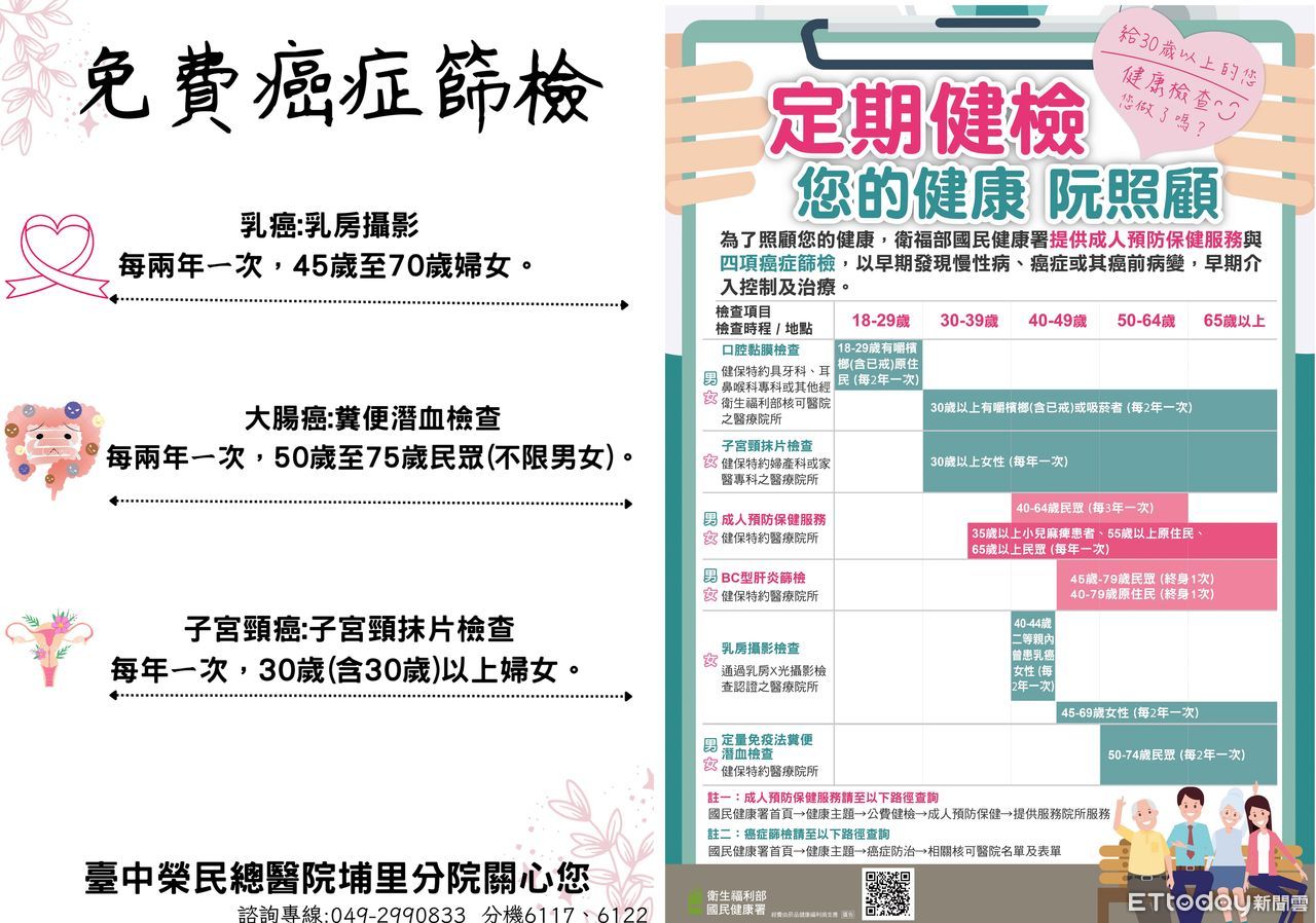埔榮表示,民眾可針對需求預約健康檢查,也讓媽媽過一個健康、快樂的母親節:1.成人健康檢查:40至64歲民眾每3年一次,35歲以上小兒麻痺患者、55歲以上原住民、65歲以上民眾每年1次;2.乳房攝影檢查:45至69歲女性每2年1次;子宮頸抹片檢查:30歲以上女性,每年補助1次。