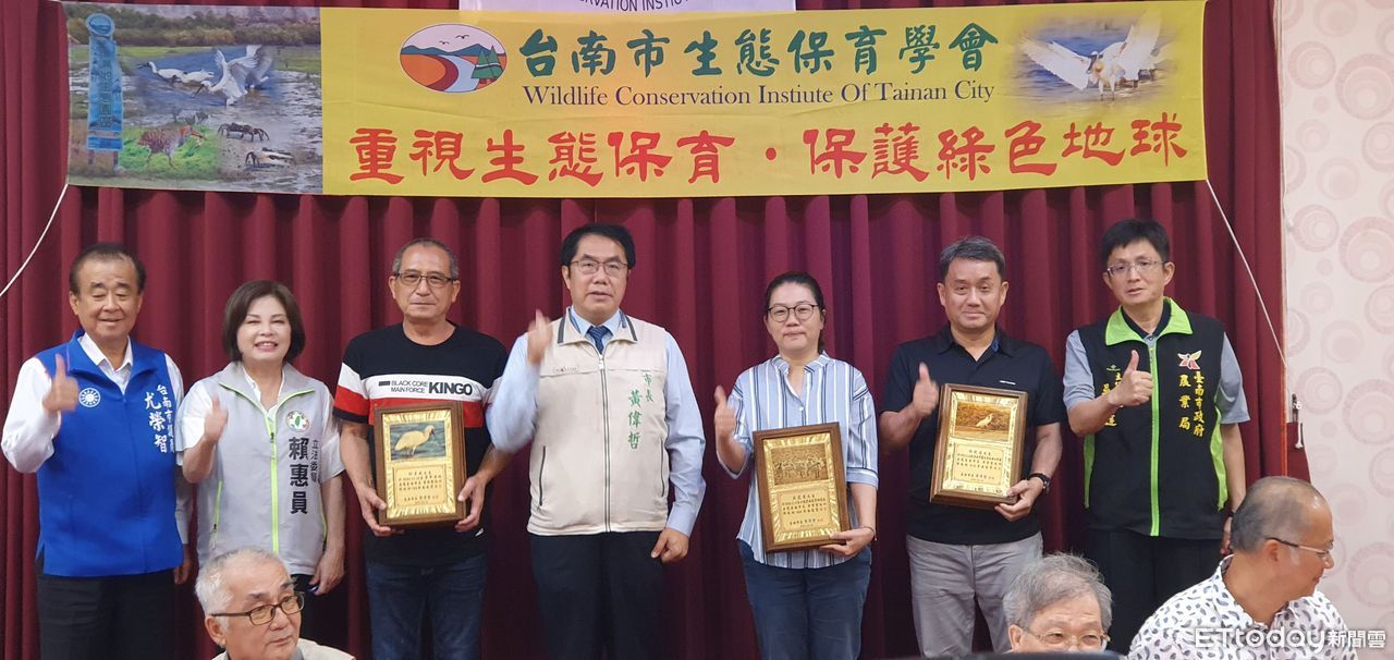 ▲台南市長黃偉哲,頒獎表揚3位尋獲任內野放傷癒黑琵鳥友。(圖/記者林悅翻攝,下同)