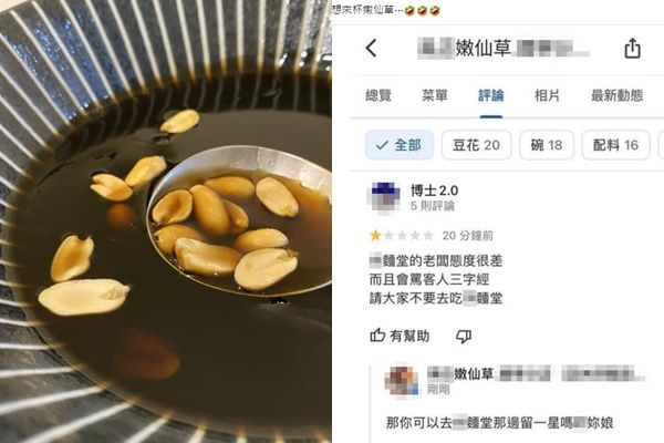 用餐後,不管對餐點或服務態度有任何想法,大多可以上「Google評論」給星星和留評論。近日就有人在某家仙草店的評論處給1星,直言老闆態度差,還會罵三字經,結果隨即被業主反嗆「X你X」。而雙方回應,也讓大票網友笑翻直呼,「老闆超氣」、「看了一直笑」。