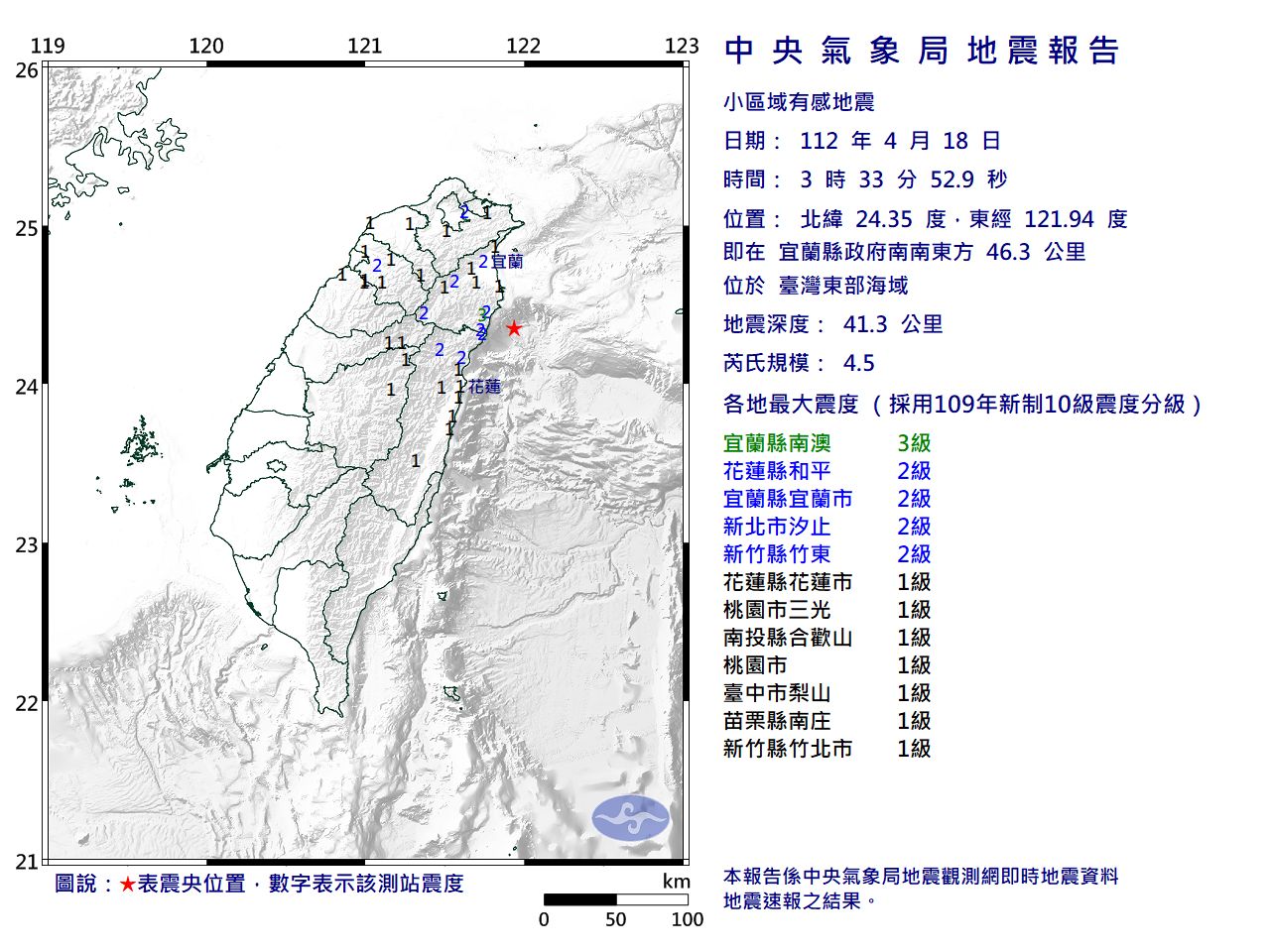緊接著凌晨3時33分也發生規模4.5地震,震央位於東部海域,深度41.3公里,宜蘭縣最大震度3級,花蓮縣、新北市、新竹縣震度2級,桃園市、南投縣、台中市、苗栗縣震度1級,幾乎半個台灣有感。
