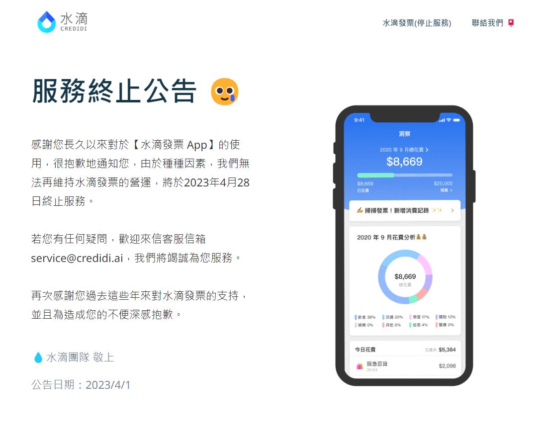 水滴發票日前貼出公告,表示「感謝您長久以來對於水滴發票APP的使用,很抱歉地通知您,由於種種因素,我們無法再維持水滴發票的營運,將於2023年4月28日終止服務。」