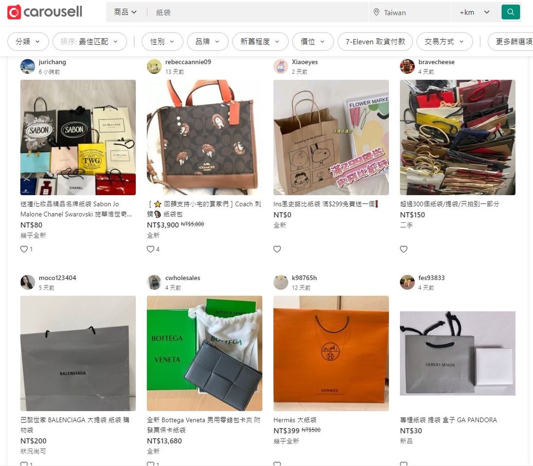 ▲不少人會把名牌精品的紙袋上架到拍賣平台販售。(圖/翻攝自旋轉拍賣)