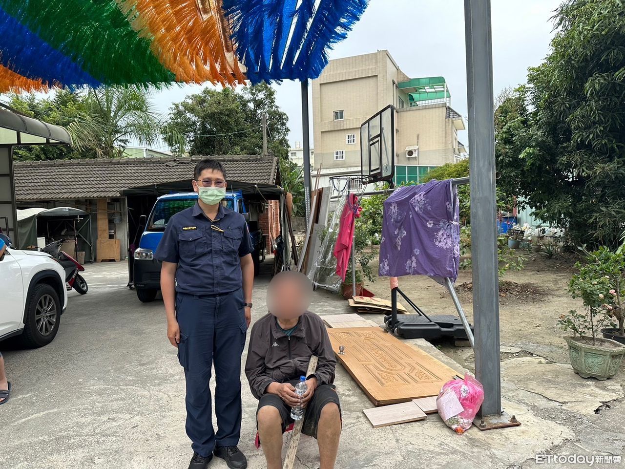 ▲警方挨家挨戶訪尋是否有見到落單老人,過然在一處民宅空地發現走失的老翁,立即通知家屬前來確認。(圖/記者蔡佩旻翻攝)