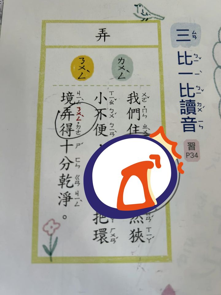 只見原PO發出的照片,課本中分別有「我們住巷弄」以及「把環境弄得十分乾淨」這兩個句子,而兩個「弄」有著不一樣的讀音,課本也特別用紅字標出提醒學生,巷弄的讀法為「ㄒㄧㄤˋㄌㄨㄥˋ」,把環境「弄得」乾淨的讀法則是「ㄋㄨㄥˋㄉㄜ˙」,讓原PO傻眼,自己唸了大半輩子,原來都唸錯了,也直呼「小三國語好難啊,我去考試一定不及格」。