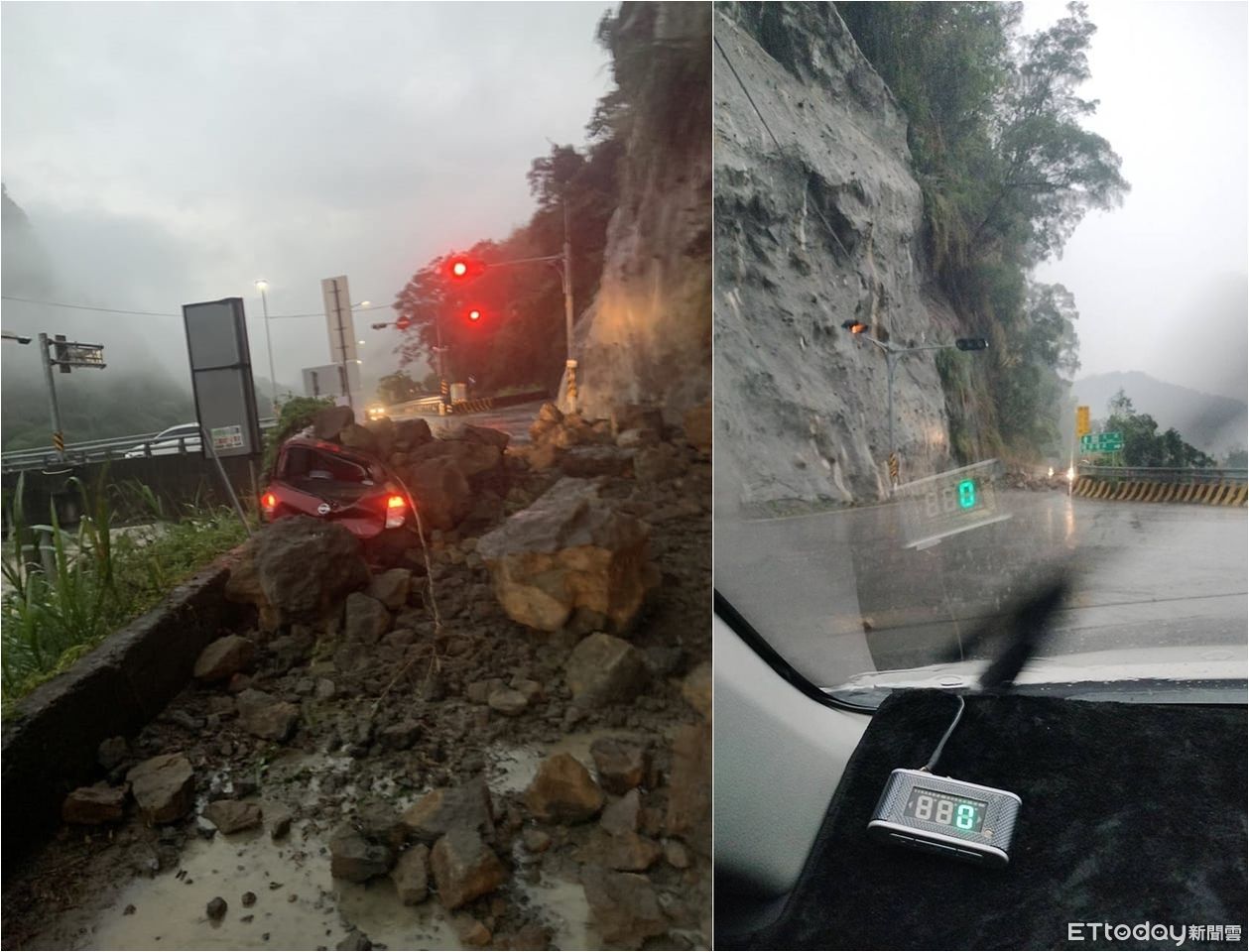 ▲苗栗大湖通往泰安的苗62線1.6k發生落石坍方,砸中一部自小客車,駕駛輕傷自行就醫,目前道路中斷。(圖/記者蔡文淵翻攝,下同)