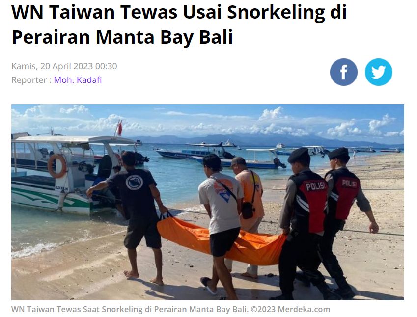 印尼「論壇新聞」(Tribunnews)及「點滴網」(Detik)等媒體報導,昨天有一名台灣遊客在珀尼達島參加浮潛活動時死亡,當地警察局長伊達(Ida Bagus Putra Sumerta)說,這名男子浮潛時,被同行遊客發現沒有動靜,隨後送至岸邊並緊急送醫,仍不治身亡。