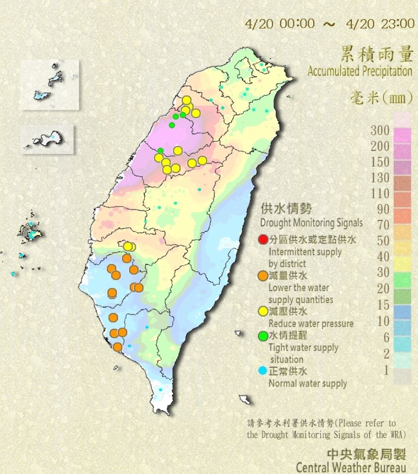 中央氣象局指出,20日中午前在新竹到雲林間有短延時強降雨,24小時累積雨量最大在苗栗泰安鄉420毫米,達大豪雨標準,降水集中在中部,新竹縣至雲林縣有豪雨「紫爆」等級的降雨。根據水利署統計,全台水庫約有一半都有進帳,以台南烏山頭水庫最多,2天下來,蓄水上升了9.3%,因為曾文水庫放水至烏山頭續存;其次為寶二水庫4.9%,曾文水庫則持續下降1.6%,「庫存」仍只有8.6%。