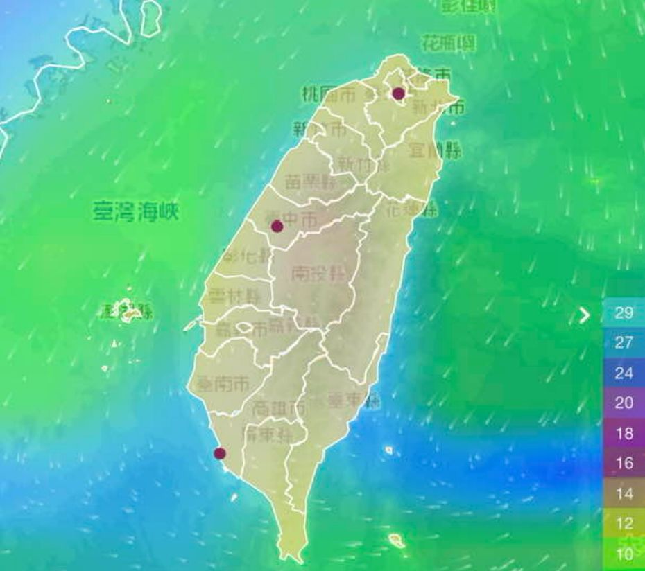 溫度方面,受鋒面通過後的東北風影響,北部及東半部天氣稍涼,高溫約22到26度,中南部高溫28到30度,夜晚清晨各地低溫約20到23度。