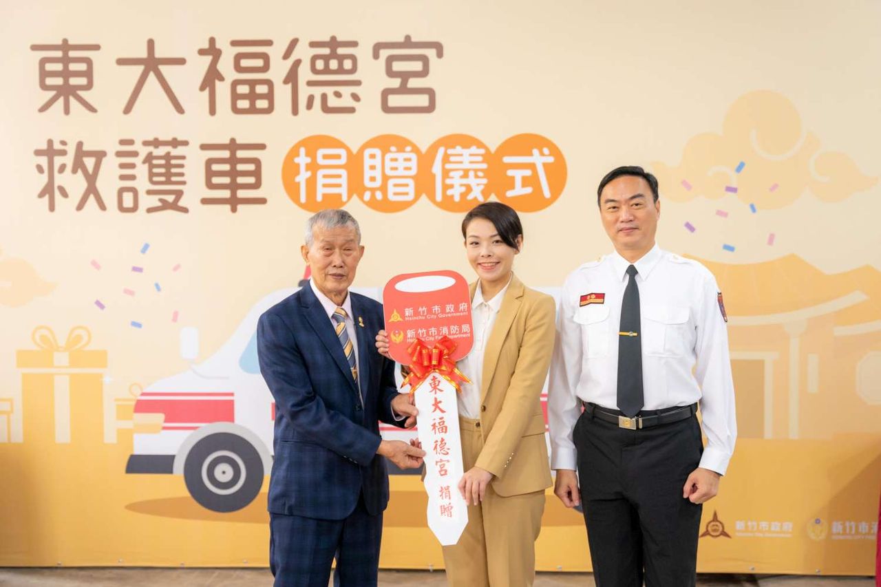 東大福德宮為實現福德正神扶弱濟世之精神,在鄭榮一主委及各委員們的發起下,購置功能完善且更安全,造價約360萬的救護車1輛,今(21)日上午由新竹市長高虹安親自主持救護車捐贈儀式,代表消防局接受捐贈,並回贈東大福德宮感謝狀及救護車紀念模型,感謝東大福德宮及各委員們熱心公益造福地方,協助守護新竹市民安全。