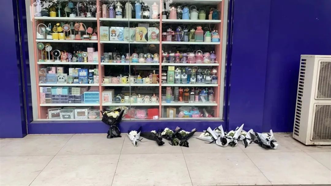 事情引起熱議之後,該文具店已從內反鎖暫停營業,門口有不少人送來菊花,還附有卡片,寫有「關門大吉、早日倒閉」等字樣。隨後,一名自稱是鄰居的女子將這些白色鮮花收走。
