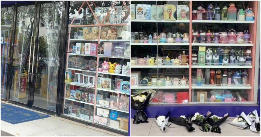 ▲文具店門口被擺放了多束白菊花。(圖/擷取自微博)