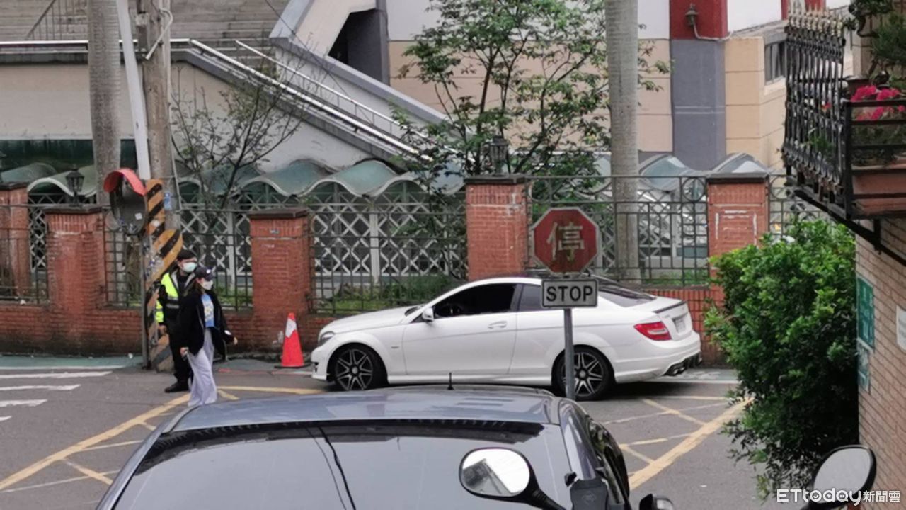 ▲世新大學後門口停放白色賓士轎車,車內駕駛明顯死亡。(圖/記者黃彥傑攝)