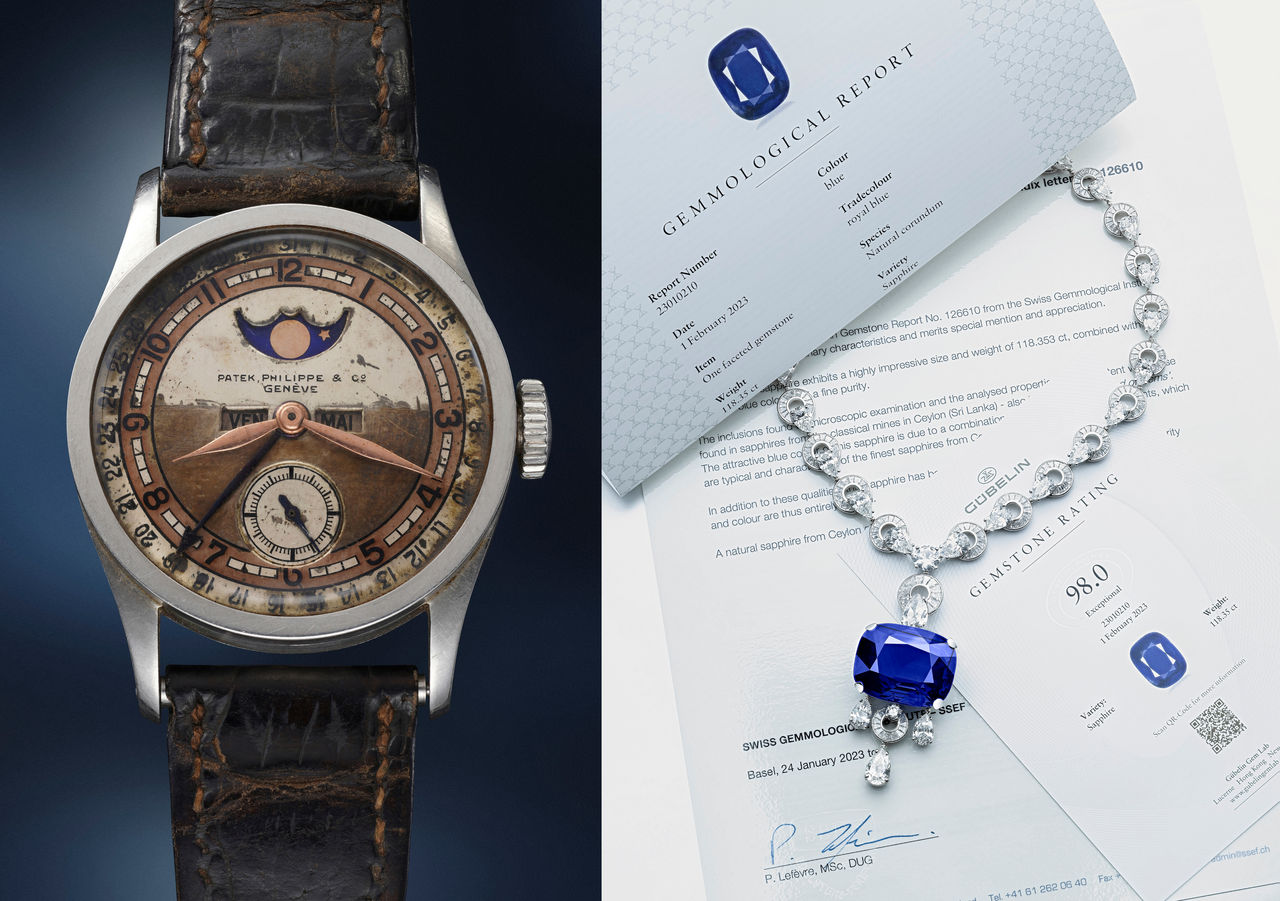 ▲左:百達翡麗,型號96QL,鉑金月相小三針腕錶,備日期、星期顯示、扇面錶盤、玫瑰金柳葉指針、1937年製。清朝末代皇帝愛新覺羅溥儀藏品,估價逾25,000,000港元。