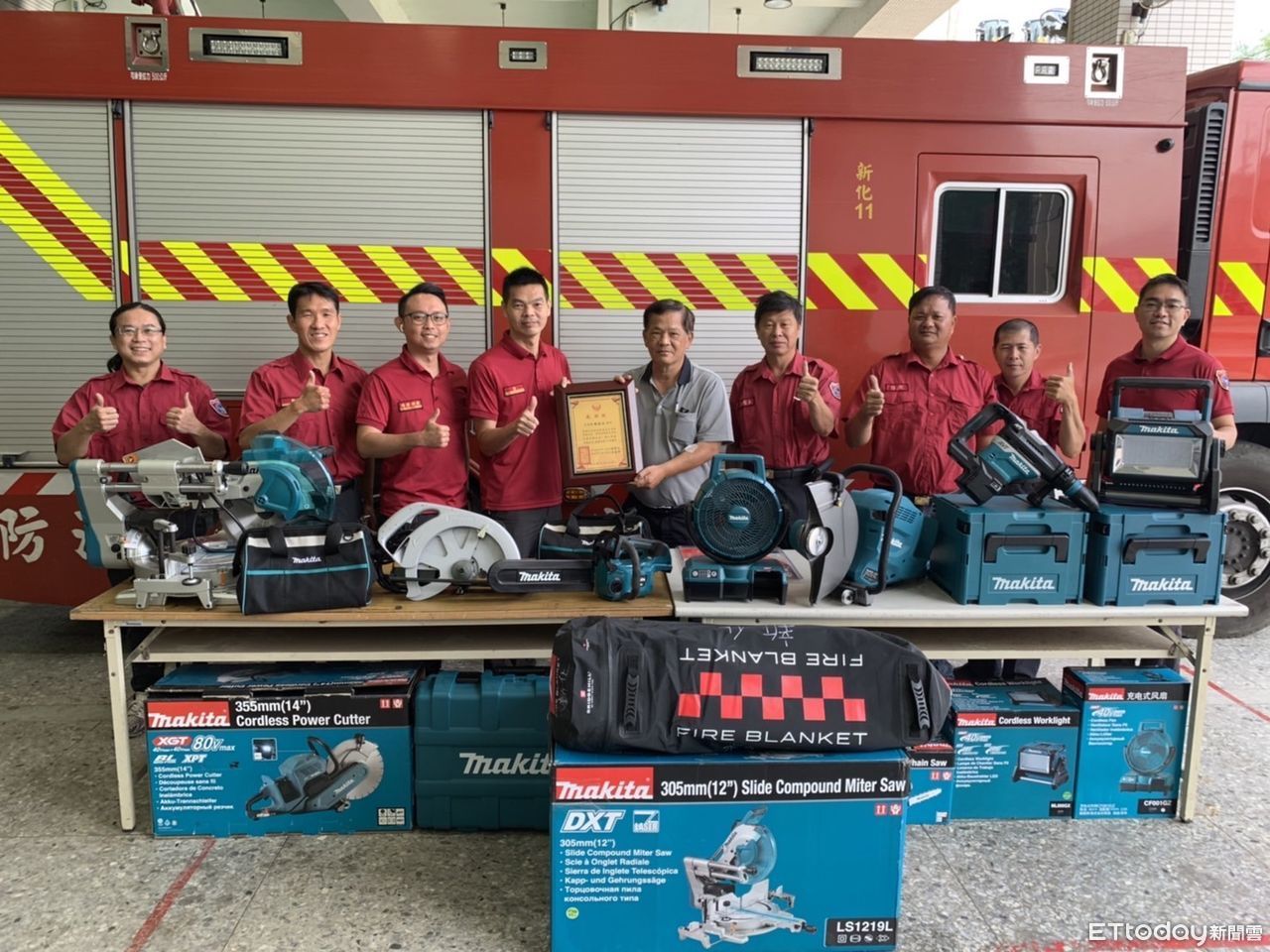 ▲台南市新化區義消顧問林金池,捐贈一批破壞器材及電動車滅火毯予消防局第四大隊新化分隊,有效提升消防人員的救災效能。(圖/記者林悅翻攝,下同)