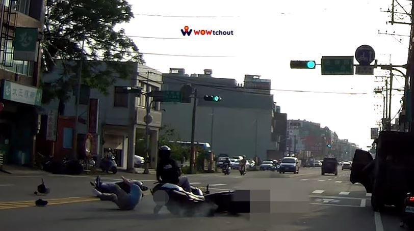 影片中,阿伯從畫面右側的路邊斜切進車道,然後一路往左行駛,就在跨進內側車道時,被後方直行的女騎士攔腰撞上,兩人雙雙摔倒在地;接著,第三名騎士發現異狀,無奈他急得「輪胎都與地面摩擦到冒煙」,仍因閃避不及撞上,整個人向前摔飛出去。