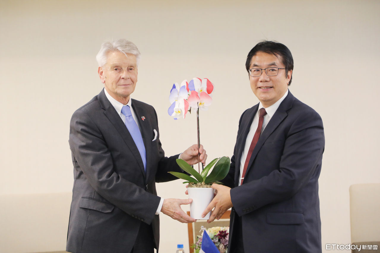 ▲法國參議院副議長暨友台小組主席李察,率跨黨派訪團和法國在台協會政治組長古哲星,拜會黃偉哲市長,獲贈法國國旗蘭花感謝長期支持情誼。(圖/記者林悅翻攝,下同)