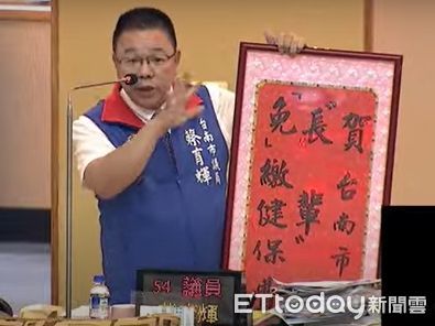 ▲國民黨團舉紅匾指出,國民黨團10多年積極為民爭取,現在黃偉哲市長同意今年7月實施老人健保全免,並承諾任期內絕不跳票,請民進黨不要「割稻仔尾」。(圖/記者林悅翻攝,下同)