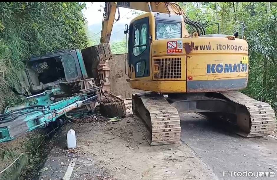 ▲苗栗三灣28日載運怪手的貨車翻車,消防隊找來大型怪手協助救援,3小時才救出受困駕駛,57歲廖姓駕駛傷重不治。(圖/記者蔡文淵翻攝,下同)