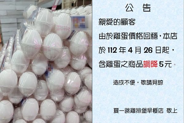 從照片可見,店家貼出的公告寫道,「親愛的顧客,由於雞蛋價格回穩,本店於112年4月26日起,含雞蛋之商品調降5元。造成不便,敬請見諒」。