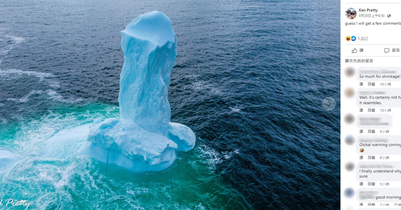 加拿大紐芬蘭(Newfoundland)每年春天都會出現許多冰山,但近期一座冰山引起多國網友的注意,因為外型真的太像男性生殖器。使用空拍機捕捉到這一幕的男子更說,雖然它不如其他冰山那樣壯觀,但仍可能有30英尺(約9.1公尺)高。
